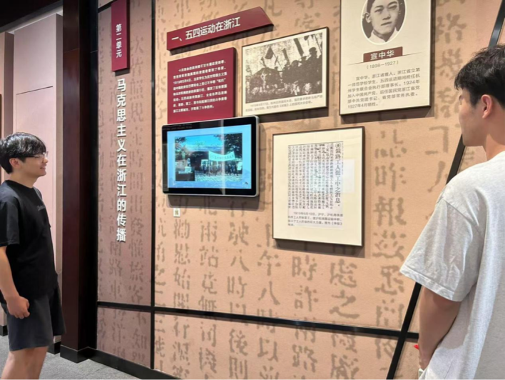 在浙江革命烈士纪念馆的展柜前,23级英语专业的周群正俯身记录战地日记的斑驳字迹,指尖划过泛黄纸页上的褪色墨迹;杭州党小组旧址的触摸查询屏前,22级计算机专业的刘志丹正反复测试互动功能,眉头随着屏幕响应延迟微微蹙起……这个7月,后宫电影院