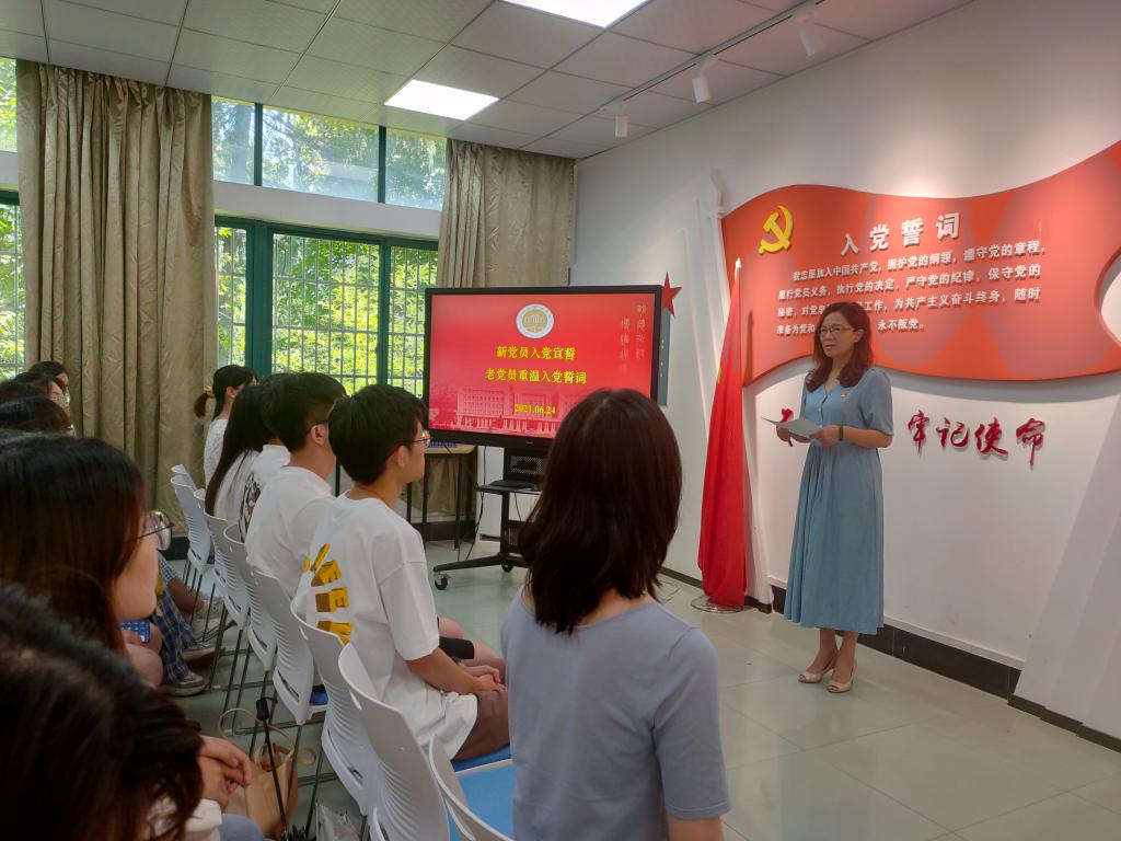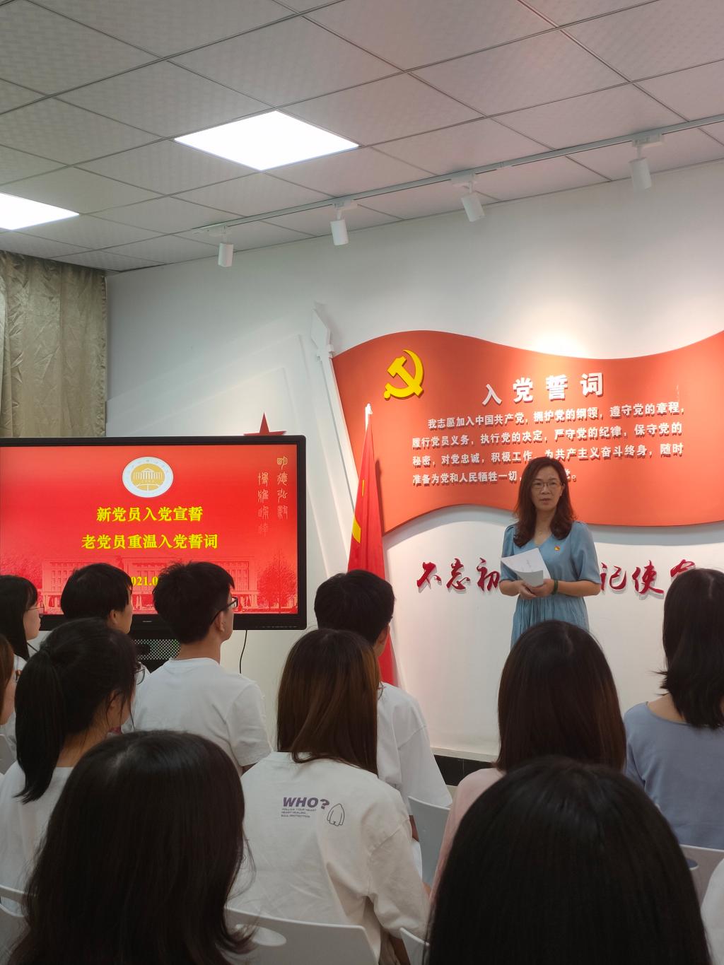 6月24日上午跨境电子商务学院、科学技术学院党总支组织迎七一·庆祝建党百年系列活动。活动包含两个篇章。第一篇章为新党员入党宣誓、老党员重温入党誓词,第二篇章为建党百年优秀电视剧展播推介会暨全国样板支部书记讲党课。