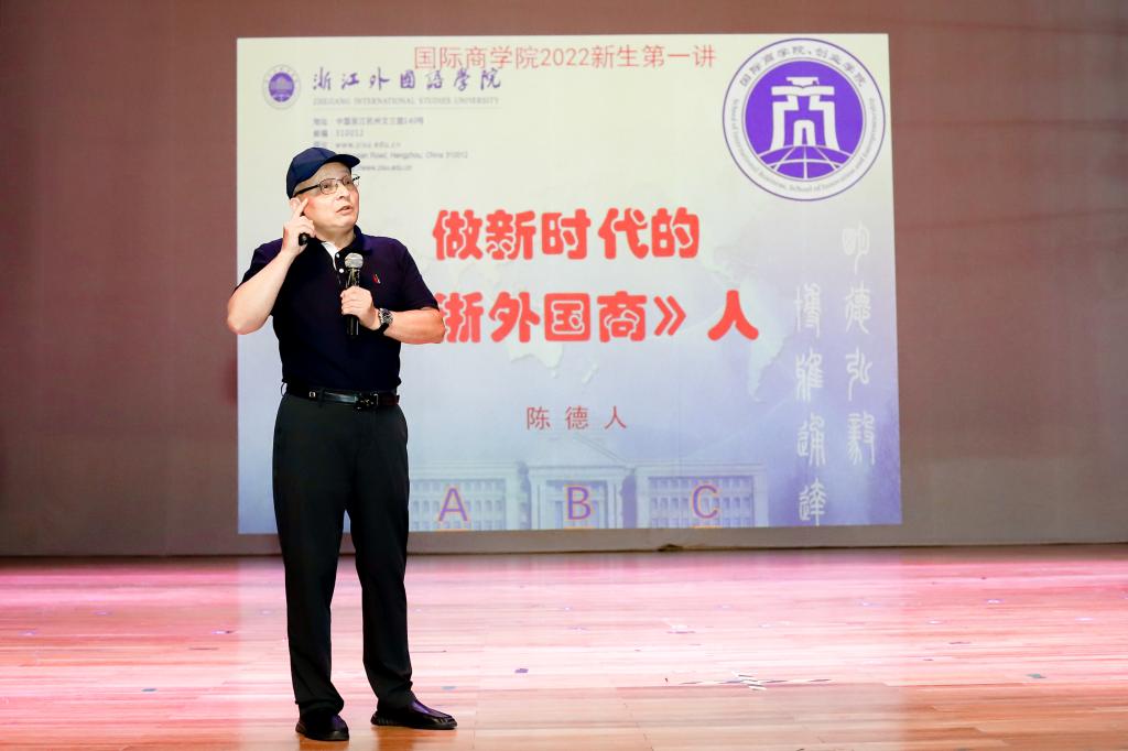 紧随开学典礼,我校资深教授陈德人为2022级新生们讲新生第一课:《做新时代开拓奋进者,做有情怀浙外国商人》。陈教授开门见山地指出,“浙外国商”是一个“品牌”、是一种“荣誉”,也是一份独一无二的“经历”。他从“你到浙外国商做什么”这一问题出发,结合详实的案例和最新的观点,引出要学会学习、学会思考以及学会沟通。他从“将来毕业后要做什么样的人”这一问题出发,引导国商学子立足当下的同时更要放眼世界,和千千万万的学子一样融入时代大潮,用不断迭代的学习、思考和沟通去和世界建立联结,成为新时代的弄潮儿。陈教授风趣幽默的演讲赢得台下阵阵热烈的掌声。