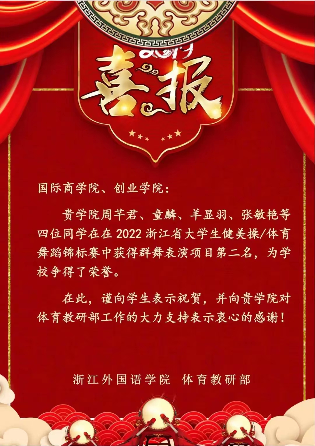 喜报 | 后宫电影院 学生在 2022 浙江省大学生健美操/ 体育舞蹈锦标赛中获得群舞表演项目第二名