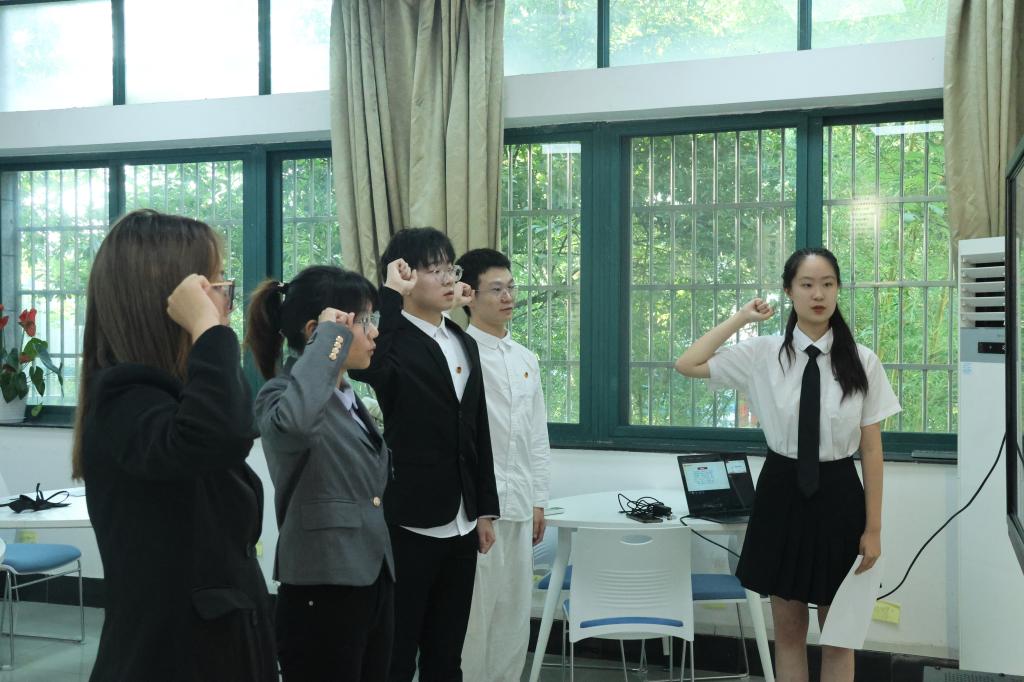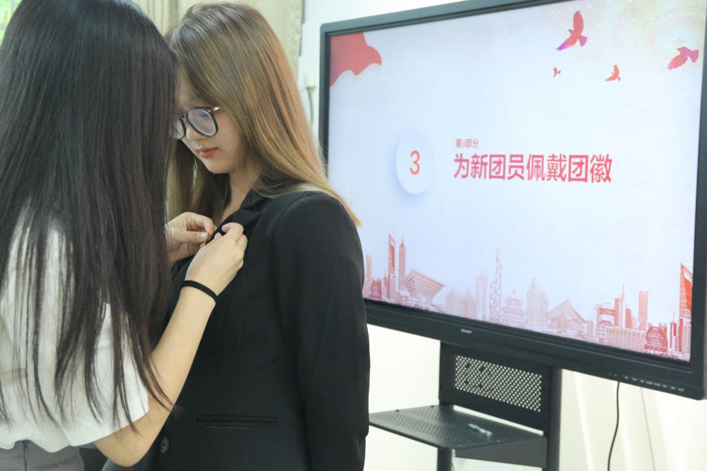院团委负责人柯惠玲为新团员戴上鲜艳的团徽,一枚枚在新团员的胸口熠熠生辉,它将时刻提醒我们,作为新时代大学生,要以最高标准严格要求自己,在新征程上刻苦学习,用实际行动来践行“永远跟党走”的初心和誓言,主动担负起党的助手和后备军的时代责任,不负党和国家对我们的期望。