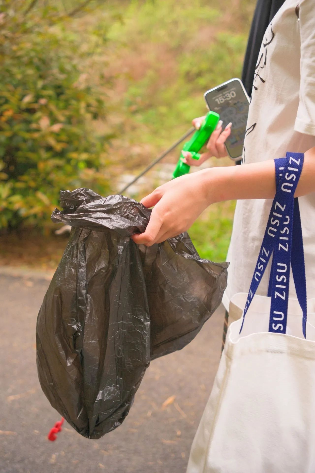 青年志愿者们分工协作,有的负责清理近处道路上的垃圾,有的则深入草丛,捡拾被风吹散的废弃物。大家手持垃圾袋、夹子等工具,一起找、一起干,一下午的时间在清理行动中流逝的很快。他们用自己的双手为这片山林拂去尘埃,致力于恢复其原本的清新与美丽。