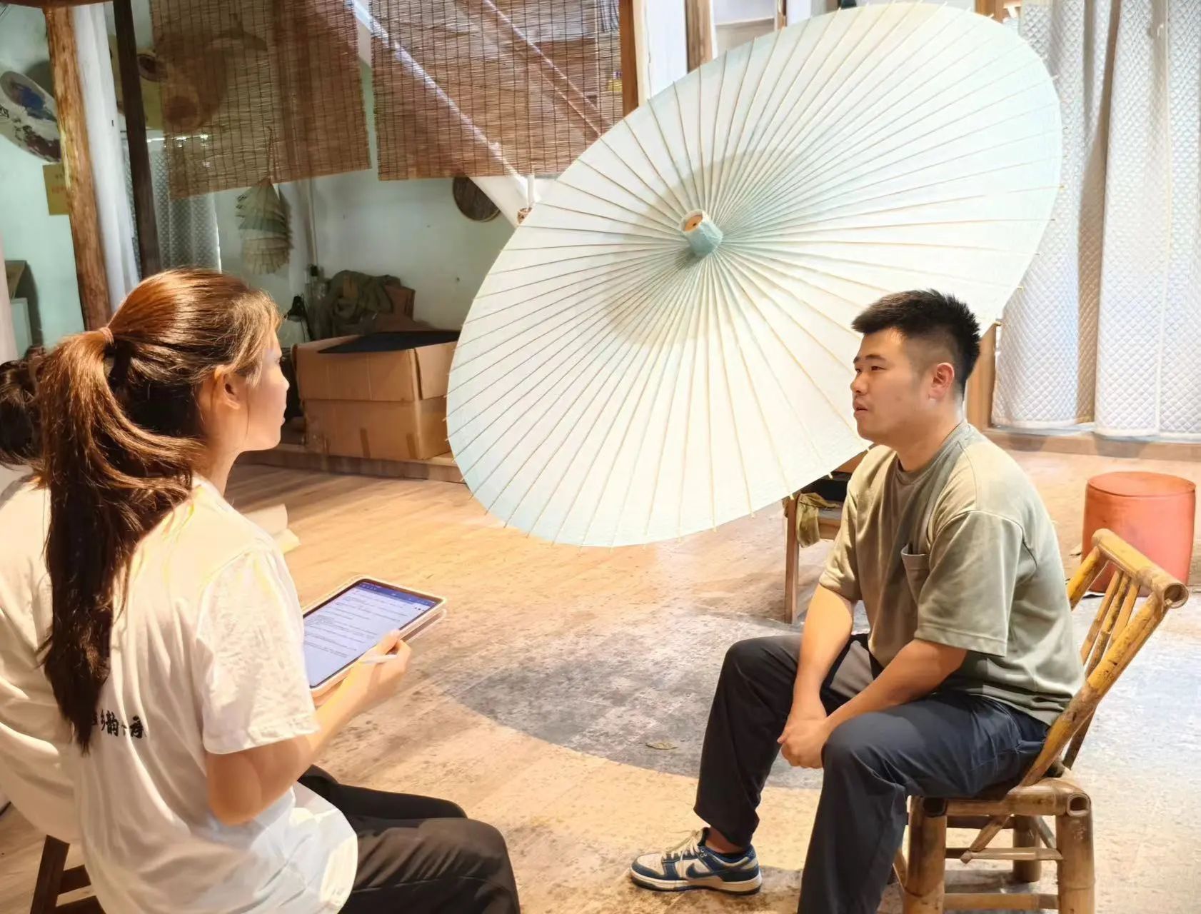 在余杭纸伞之家,团队成员采访了非遗油纸伞第三代传承人刘伟学先生,他以丰富的经验和深邃的洞察,与成员们分享了油纸伞制作背后的点滴故事,他谈道:“在不改变制作工艺的前提下,我们从各个方面寻找了油纸伞制作的创新点,而色彩的搭配、时尚元素的点缀正是最契合市场的突破口。”从非遗技艺到创新之路,一代代传承人用“匠心精神”在追求卓越的道路上不断攀登。