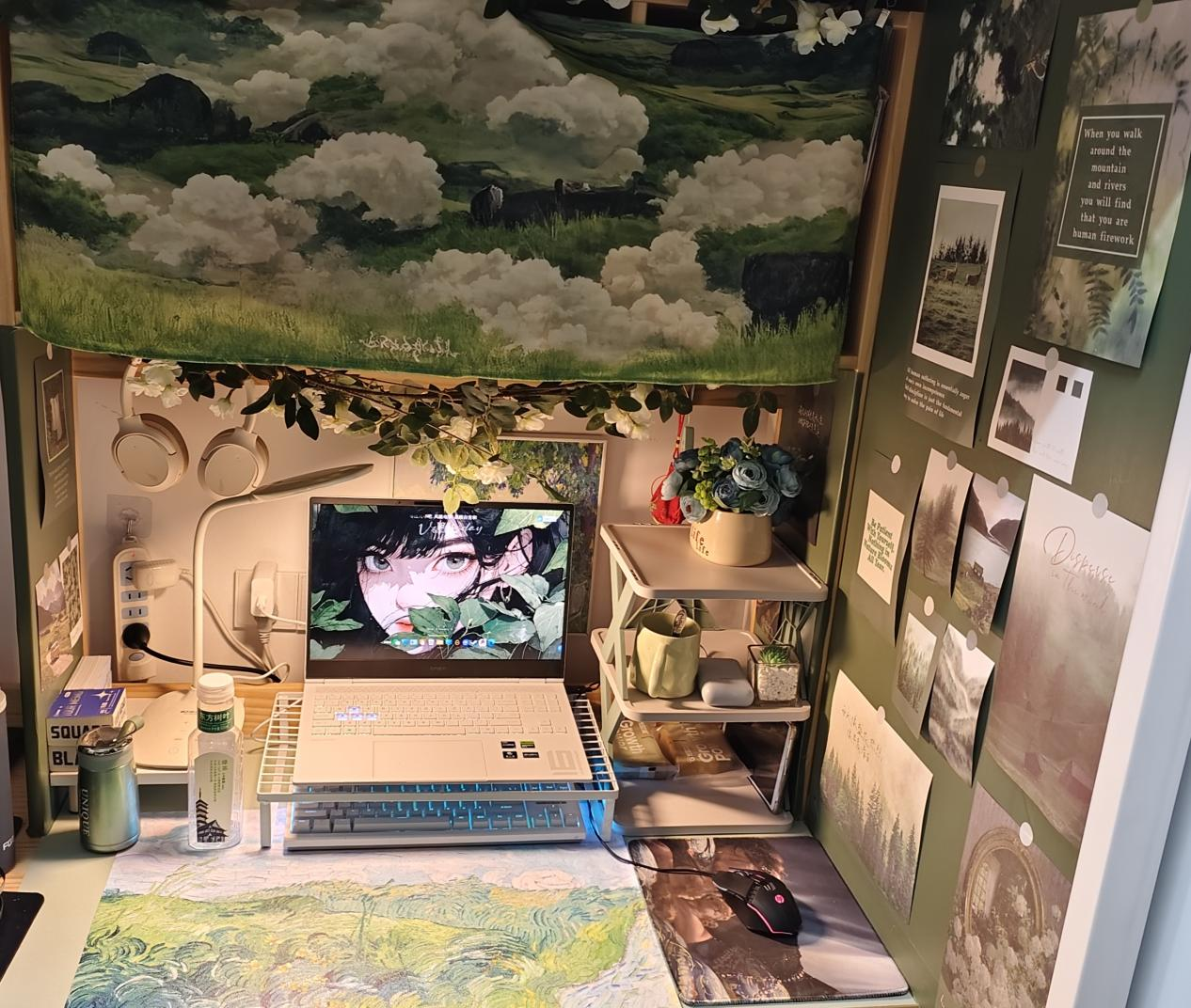 设计理念:“星云小筑”——寝室的星芒与温情。以星星为元素,将寝室打造成一个温馨的“星空小屋”。我们选择使用暖黄色星星造型的串灯,将其缠绕在床架与书桌间,既提供了柔和的光线,又增添了星星元素的融入感,仿佛置身于星云中;又与窗外朦胧的群山交相辉映,营造出静谧的夜空氛围。