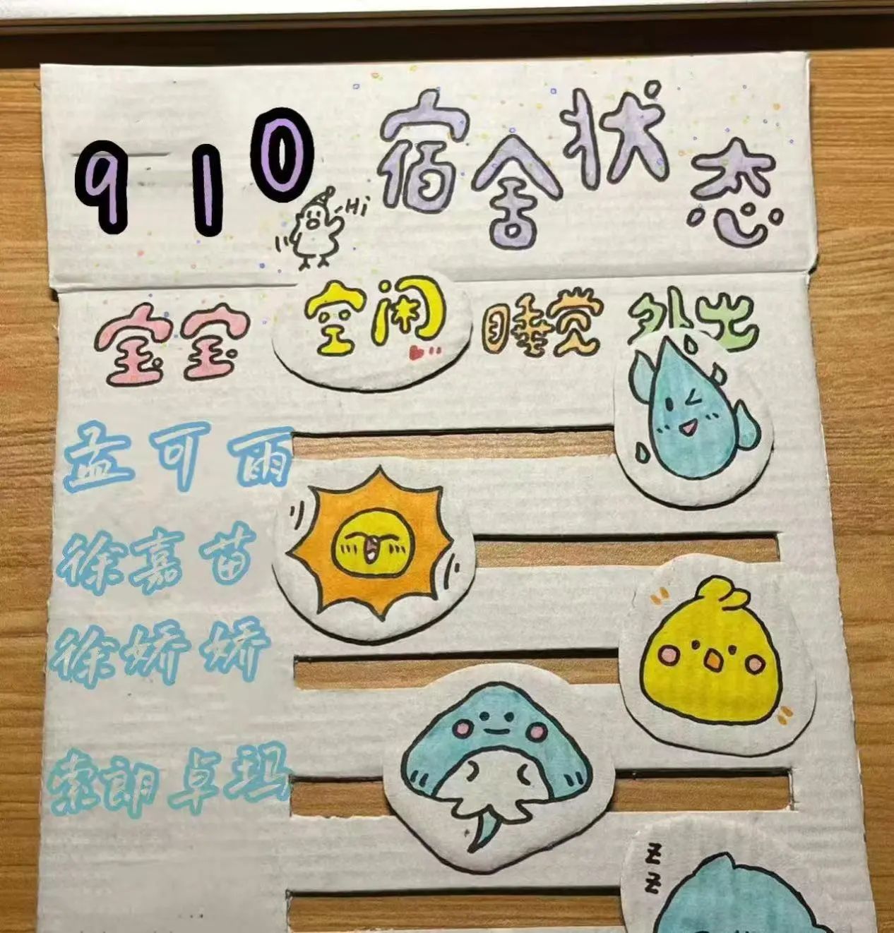 设计理念:“室事如意”。希望寝室作为个人与集体生活的小空间,可以促进成员们的和谐共处。所以有了寝室门口的“福”字窗花和“充电站”的设计。“更上一层楼”是我们认为寝室也是学习与成长的空间,希望我们在大学的学习中可以学业有成。