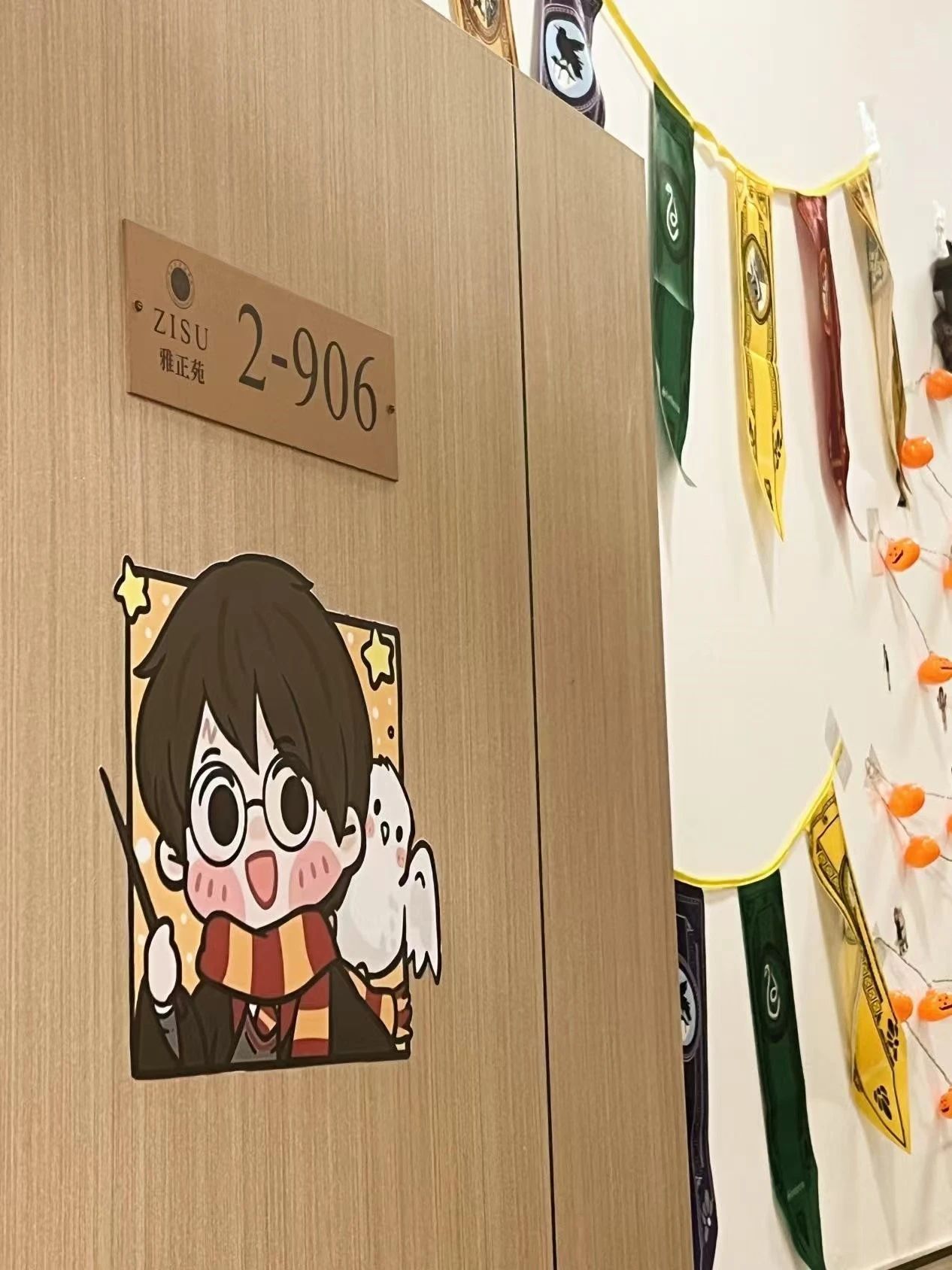 设计理念:以霍格沃茨四大学院为灵感,采用红金、绿银、蓝铜、黄黑的色彩搭配,营造独特的魔法寝室氛围。墙壁装饰以学院旗为特色,增添魔法气息。利用光影效果,如挂灯打造神秘感。此外,墙壁还装饰有墙贴和照片,增添寝室成员们的归属感。