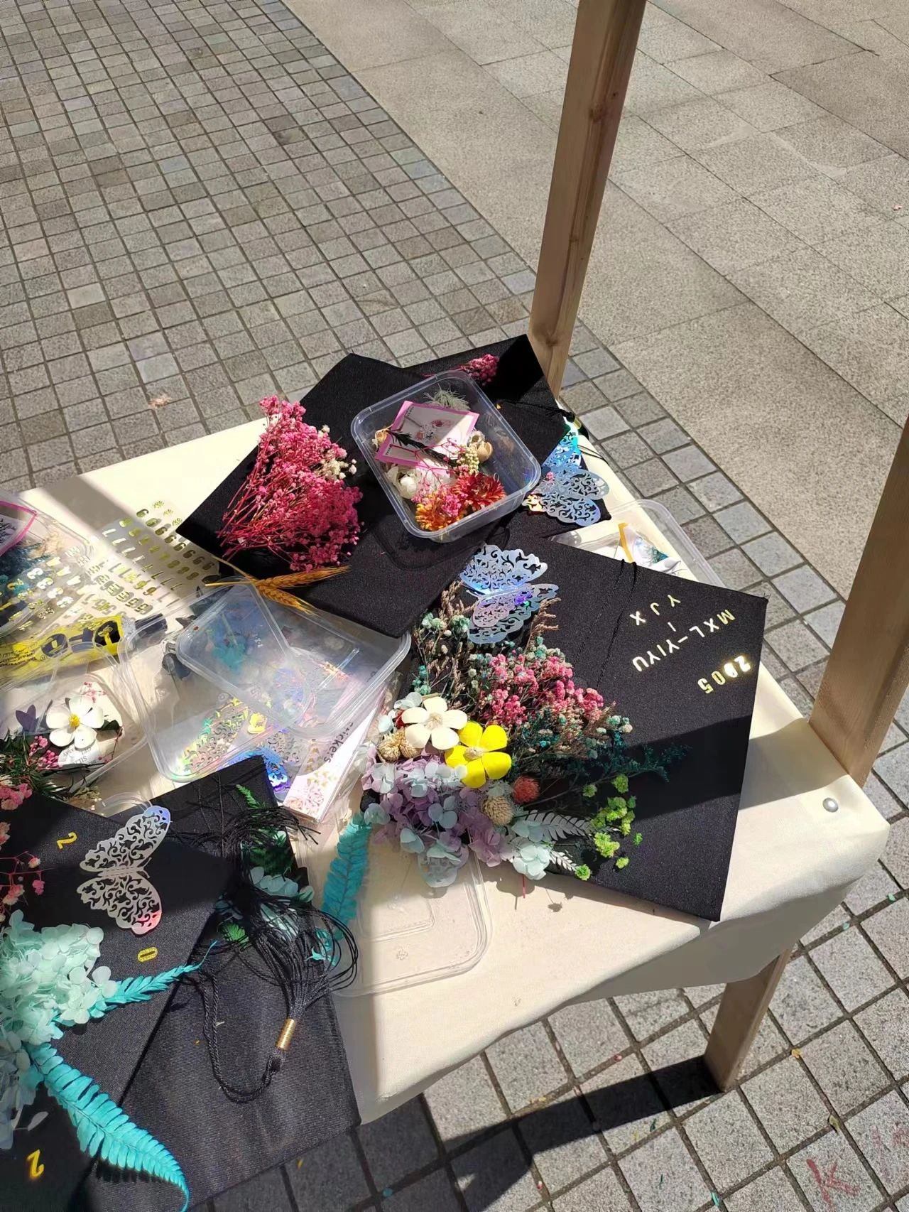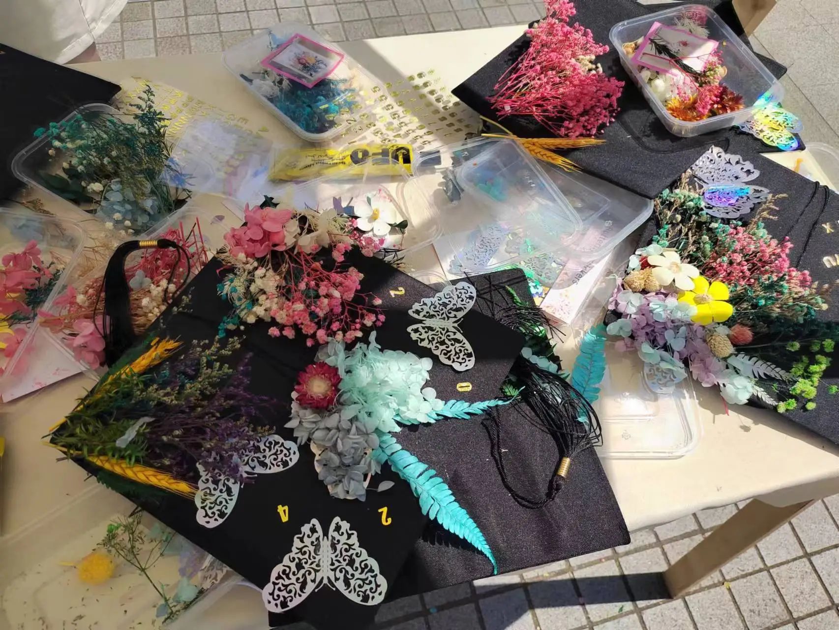静思湖畔,活动现场布置得温馨而雅致,各色花卉和手工材料摆放井井有条。参与者们在制作过程中互相交流心得,现场不时传来欢声笑语,气氛十分融洽。独特的学士帽寓意着前程似锦,象征着未来的无限可能,表达了对未来的期许和祝福,传递着正能量和积极向上的精神风貌。
