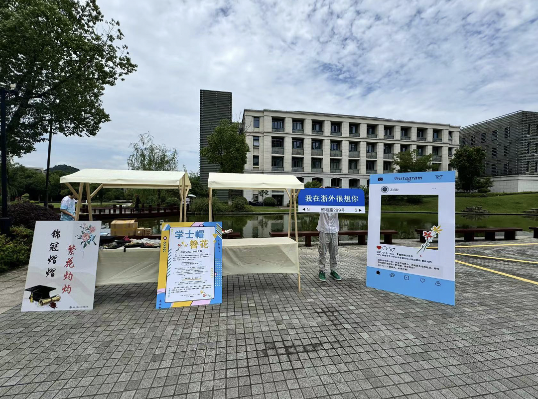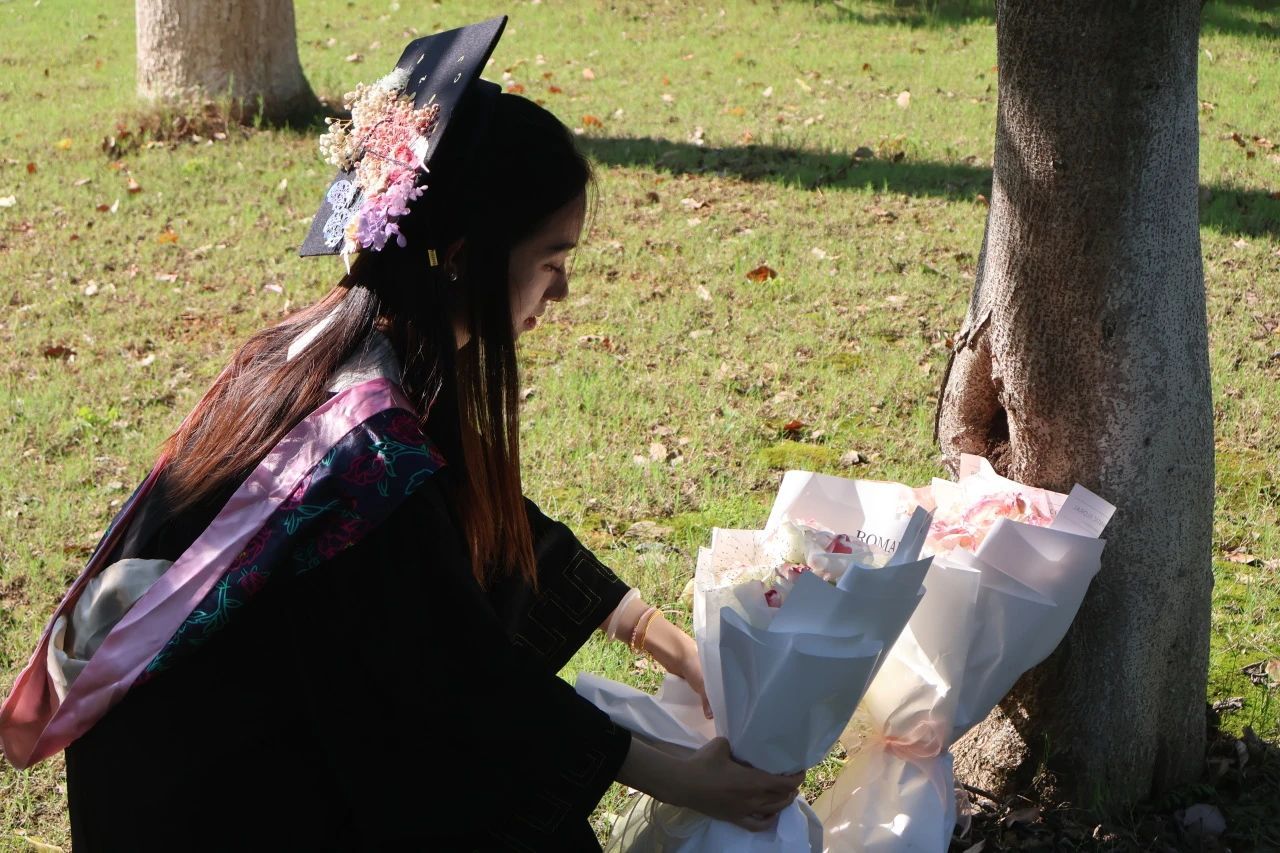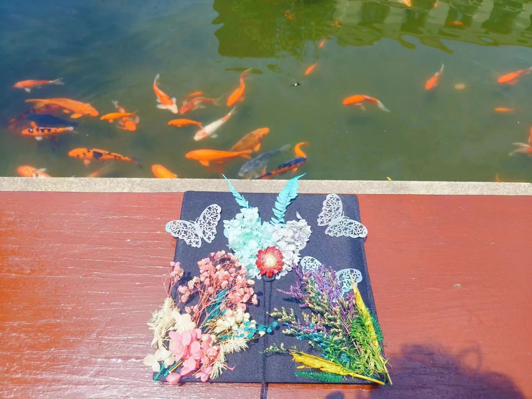 静思湖畔,活动现场布置得温馨而雅致,各色花卉和手工材料摆放井井有条。参与者们在制作过程中互相交流心得,现场不时传来欢声笑语,气氛十分融洽。独特的学士帽寓意着前程似锦,象征着未来的无限可能,表达了对未来的期许和祝福,传递着正能量和积极向上的精神风貌。