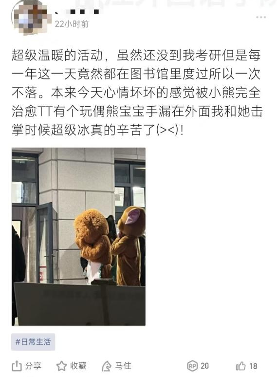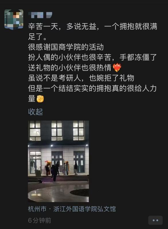 12月15日至20日,在考研倒计时的紧张氛围中,学院组织了温馨且充满力量的“爱的抱抱”活动,帮助考研学子们释放内心积压已久的紧张情绪,让他们紧绷的身心得到舒缓与放松,以更饱满的精神状态和轻松的心态迎接即将到来的考试挑战。