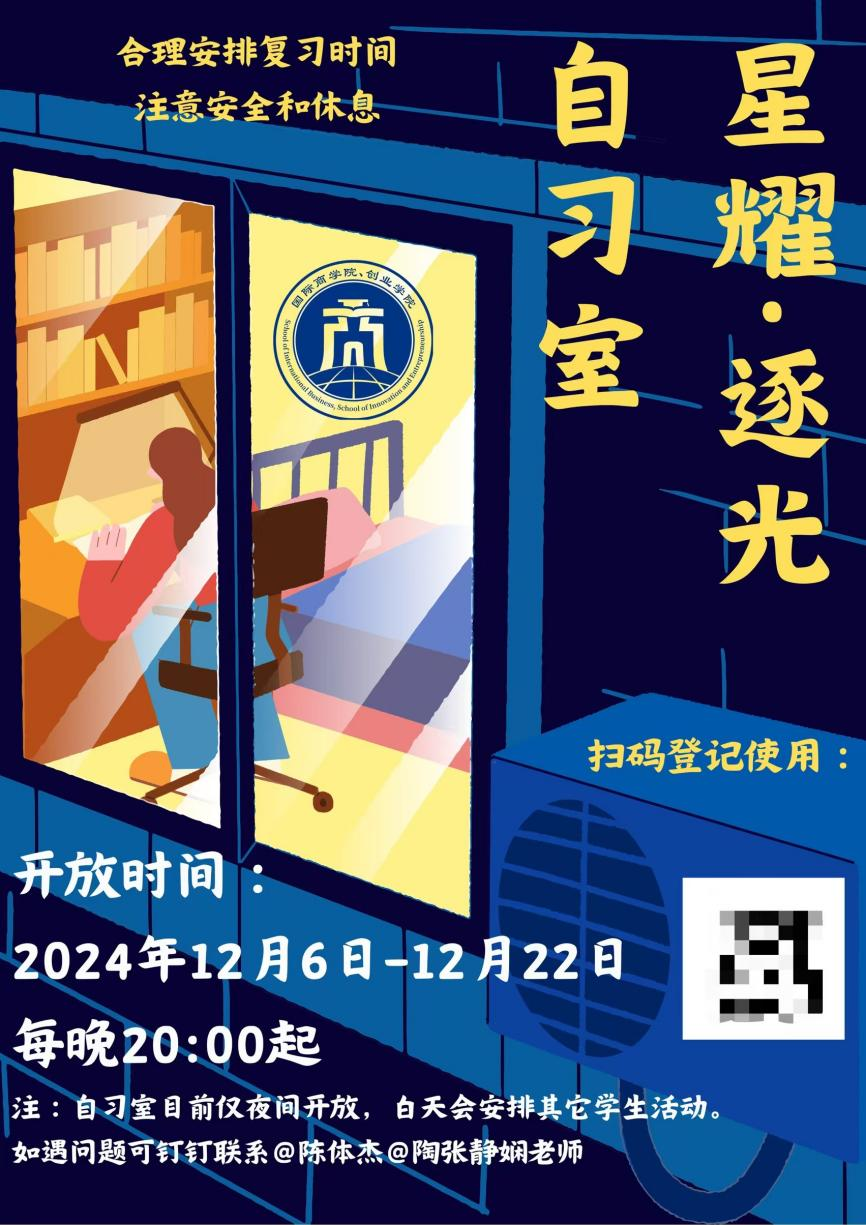 考研冲刺阶段,学院深切关注大家的需求,安排了“星耀·逐光”考研自习室,为考研学子留一盏灯,让大家能心无旁骛地在深夜复习,愿所有熬过的夜,终能变成梦想的光。