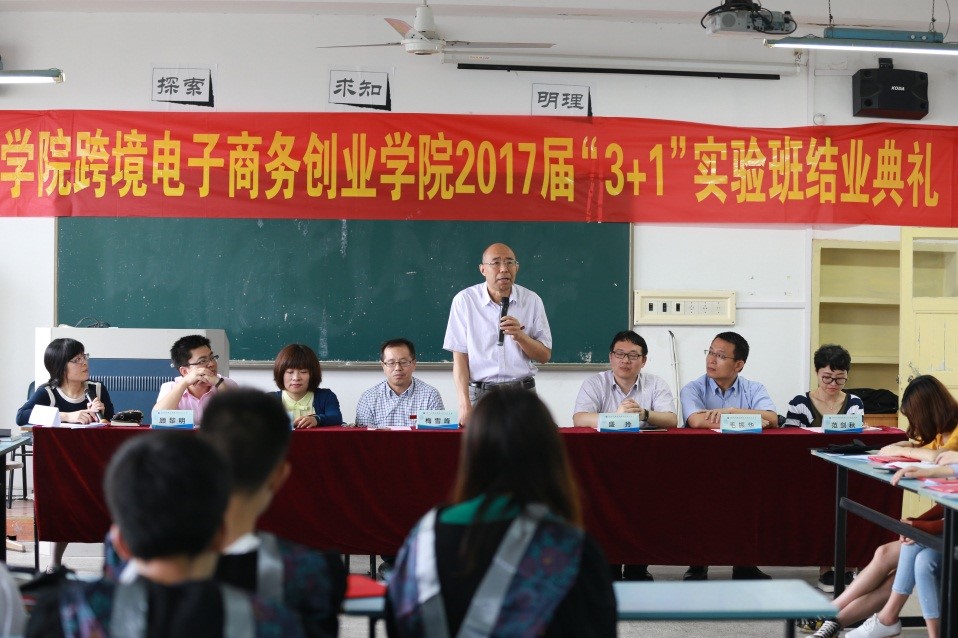 6月13日,跨境电子商务创业学院2017届“3+1”实验班结业典礼在文三校区举行。校党委副书记、跨境电商创业学院院长赵伐教授出席典礼。校党委学工部、教务处、校团委以及科技学院(跨境电商创业学院)相关负责人、创业学院办公室相关工作人员及首届“3+1”实验班44位同学参加了此次典礼。