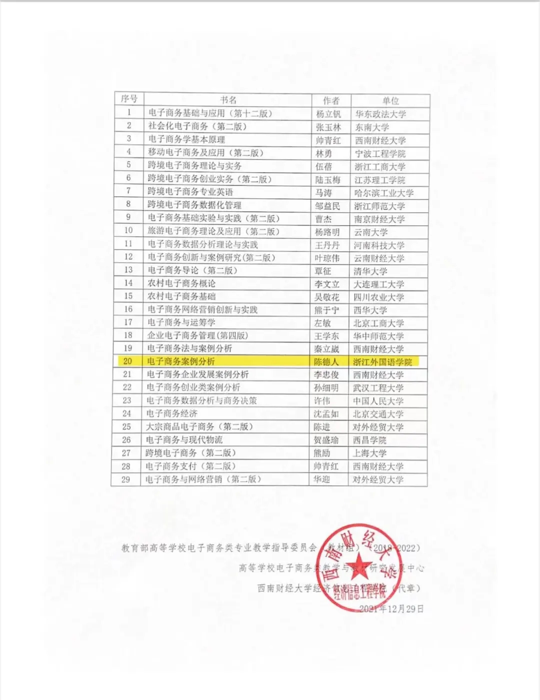 日前,教育部高等学校电子商务类教学指导委员会对第三批规划教材(“十四五”)评审名单进行了公示,由陈德人教授和方美玉教授共同主编的教材:《电子商务案例分析》顺利入选,此教材将由人民邮电出版社规划出版。据悉,这是我校入选的首本“十四五”规划教材。 《电子商务案例分析》是在陈德人教授主编的前一版教材《电子商务概论与案例分析(微课版 )》基础上再版的新教材,《电子商务概论与案例分析(微课版 )》已经累计销售6万多册,在应用中得到了高校师生的普遍认可和肯定。