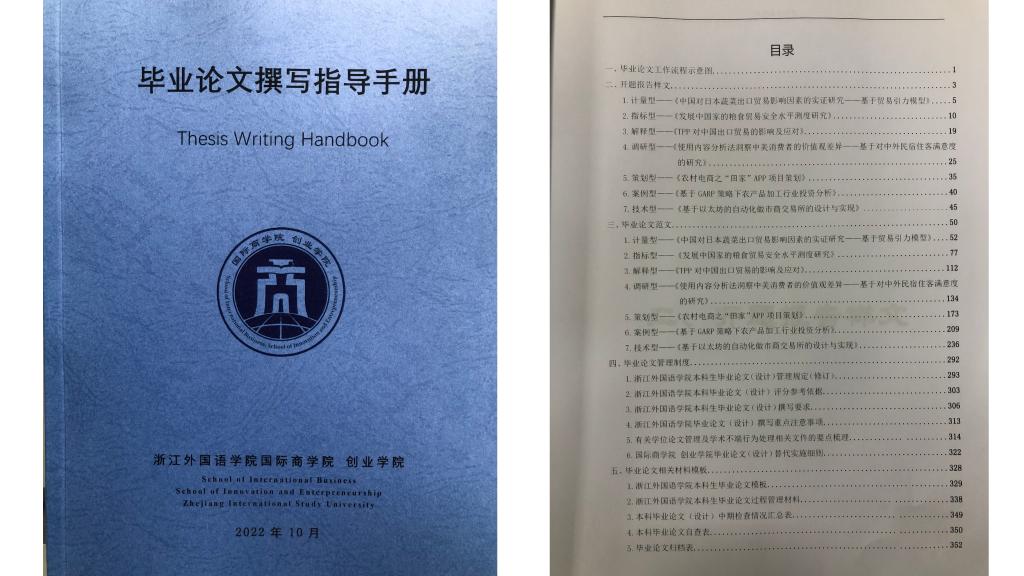 从论文的研究方法、撰写内容等方面进行考量,该手册将论文分为计量型、指标型、解释型、调研型、策划型、案例型、技术型等7类,并从学院各系历届毕业论文中精心挑选开题报告样文和论文范文供同学每人一册参考。经过学院多次研讨,历时2个月完成编撰装订成册,希望能有效助力学院师生顺利完成2023届毕业论文工作。