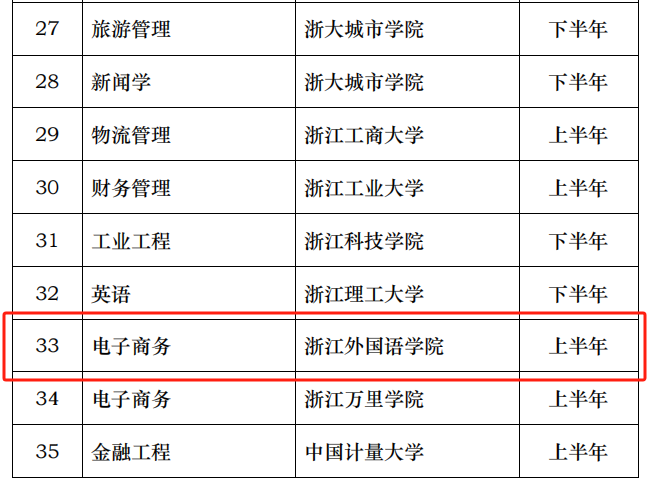 电子商务专业正式获长三角新文科联盟专业认证受理。此次受理的35个专业分别来自31所高等院校,浙江省共8所,除我校外,还有浙江工业大学、中国计量大学等7所。其中,认证电子商务专业的院校为2所。