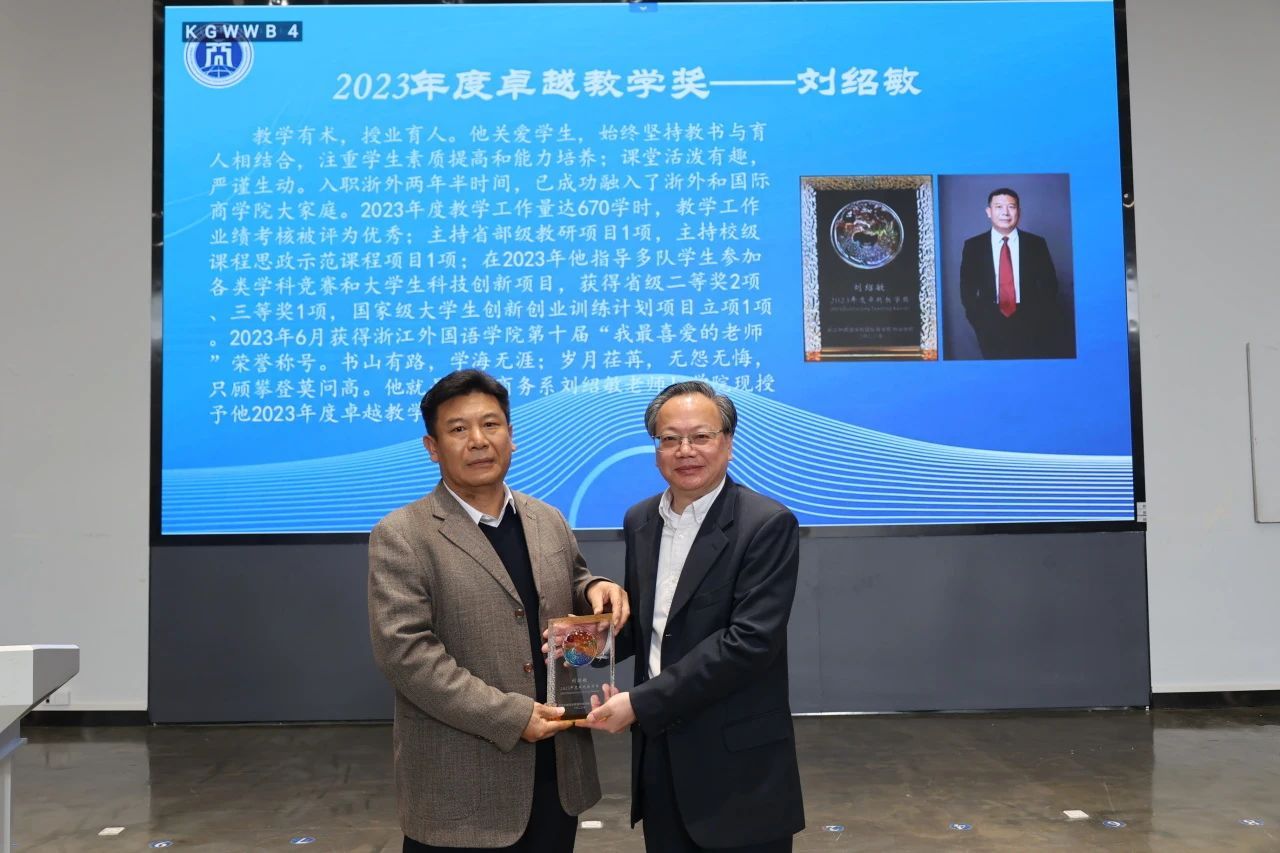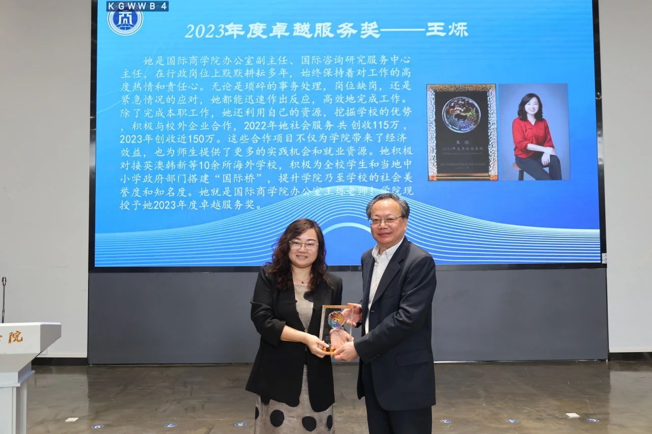 随后,大会进入了颁奖环节。范徵院长为杜龙政、刘绍敏、贾新明、王烁、陶张静娴5位教师分别颁发了2023年度卓越研究奖、教学奖、服务奖以及学科贡献奖纪念奖杯。据悉,学院年度奖项表彰今年是第二届举办,旨在落实立德树人根本任务,充分发挥榜样引领示范作用,激发教职工在教学、科研、服务、学科贡献中的热情与激情,赋能学院高质量发展。
