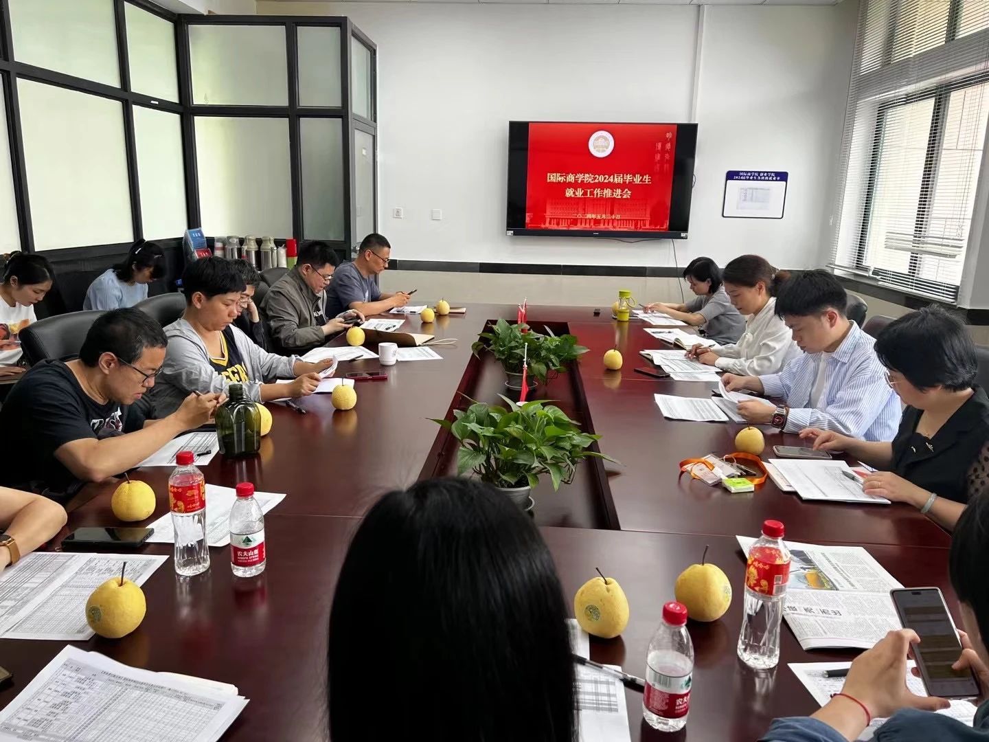 学院随即召开了2024届毕业生就业工作推进会。学院副书记郑聪霞带领系主任、班主任、辅导员等就业工作组成员,逐一分析了各班就业情况,对未落实就业学生群体进行分类分级,一生一策,一一提出指导策略,进一步夯实促进毕业生充分就业的每一步。