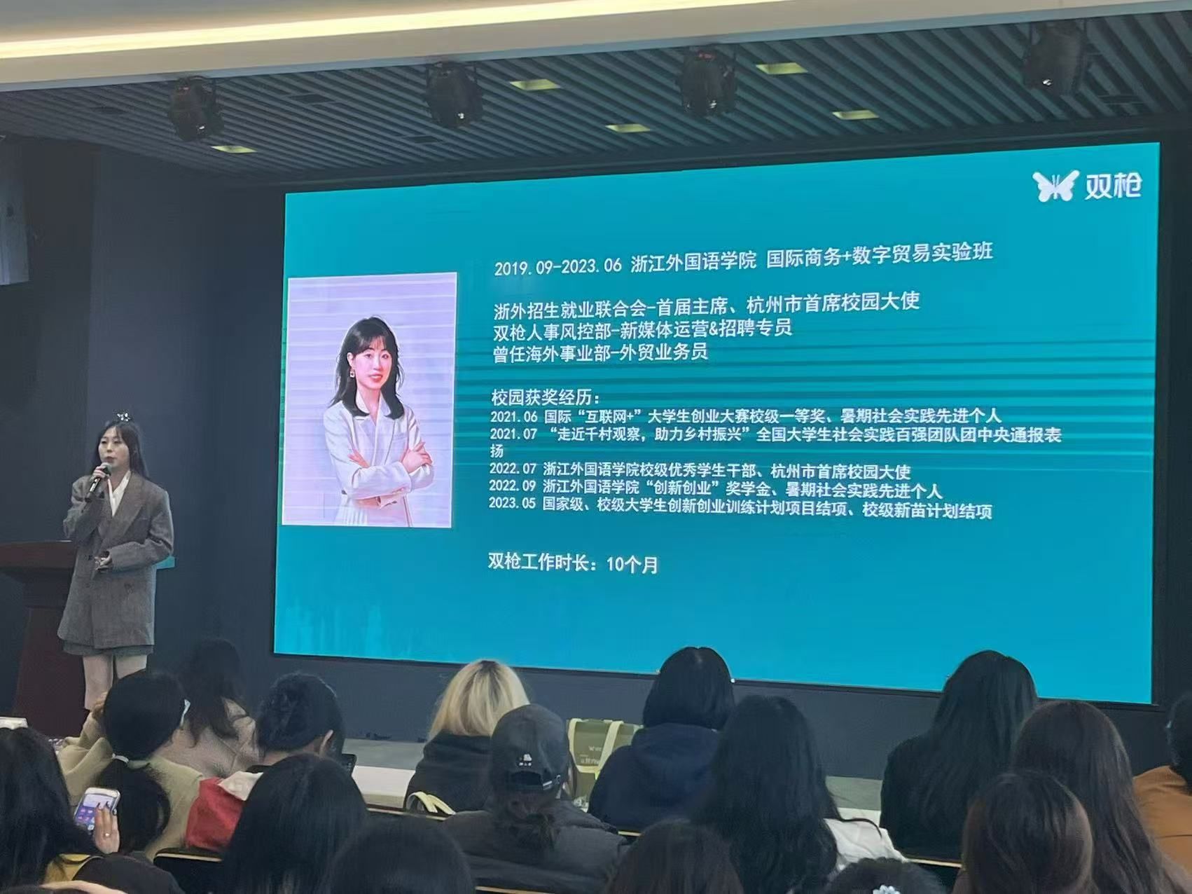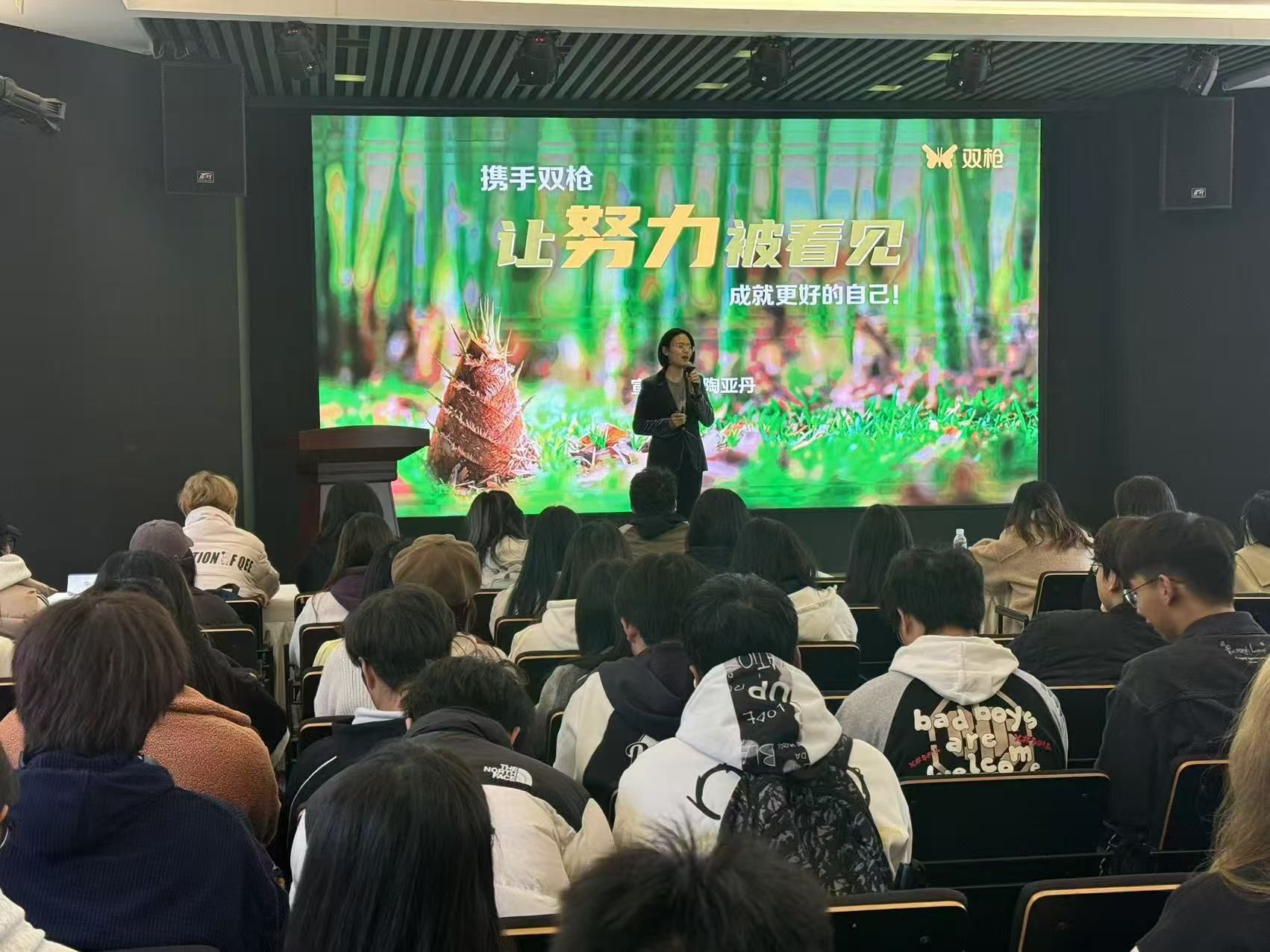 双枪科技股份有限公司人力资源总监陶亚丹以“让努力被看见,成就更好的自己”为主题,介绍了公司发展历程、产品类别及人才培养模式,鼓励同学们夯实专业知识,积极参与企业实习实践。