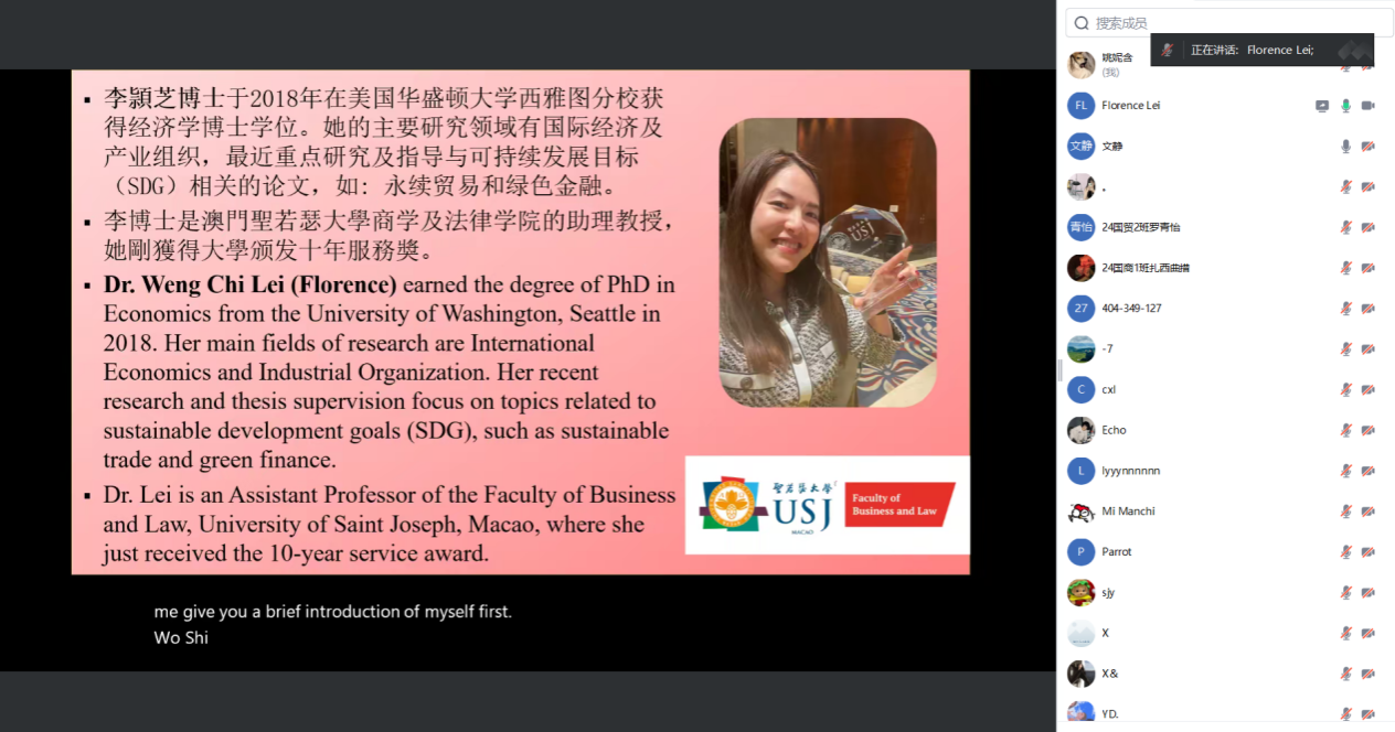 李颖芝介绍了当今世界贸易的背景,强调了国际贸易合作与跨境电商在推动全球经济增长、促进各国经济合作与发展方面的重要作用,讲解了香港和澳门的地理优势及其贸易发展形式。她从六个不同的角度深入解读了国际贸易的重要性及其中的机遇与挑战,并通过图文示例,讲解了双边贸易的基本流程。