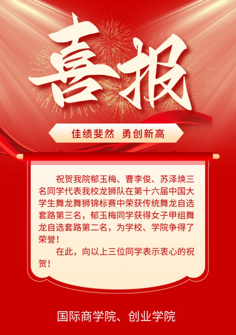 祝贺郁玉梅、曹李俊、苏泽焕三名同学在第十六届中国大学生舞龙舞狮锦标赛中为学院争得了荣誉!