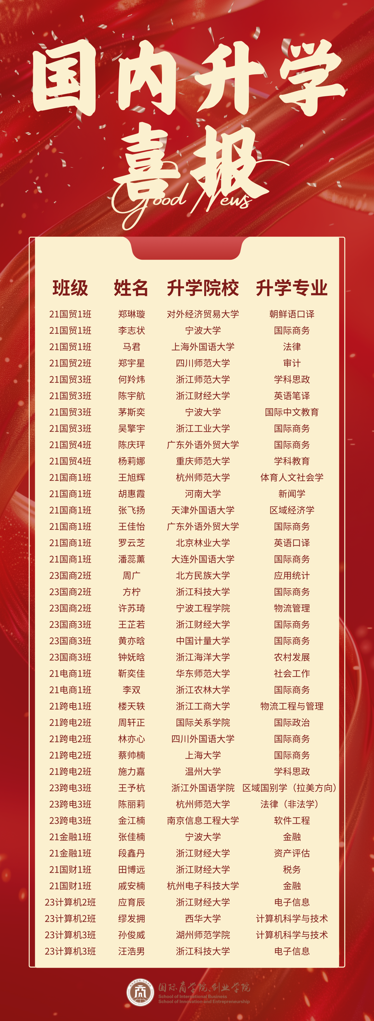 学子成功被多所名校录取,其中不乏浙江大学、华东师范大学、北京师范大学等985高校,以及上海外国语大学、对外经济贸易大学等行业强校。这份亮眼的成绩,不仅是同学们个人努力的成果,更彰显了学院的人才培养实力。