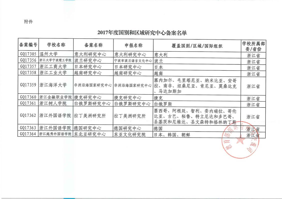 2017年度国别和区域研究中心备案名单,我校是浙江省内唯一一所同时备案2个研究中心