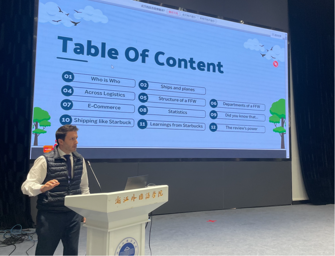 Xavier介绍了跨境电商的基本概念及其在全球范围内的快速发展趋势。他强调,随着全球经济一体化的加速推进,跨境电商已成为推动国际贸易发展的重要力量,为企业提供了前所未有的市场机遇。他还介绍了Across Logistics的发展历程以及货运转运的结构与布局,分享了西班牙跨境电商市场的宏观数据和跨境电商实务中的关键环节,并结合具体案例,让同学们更加直观地理解跨境电商的运作流程。