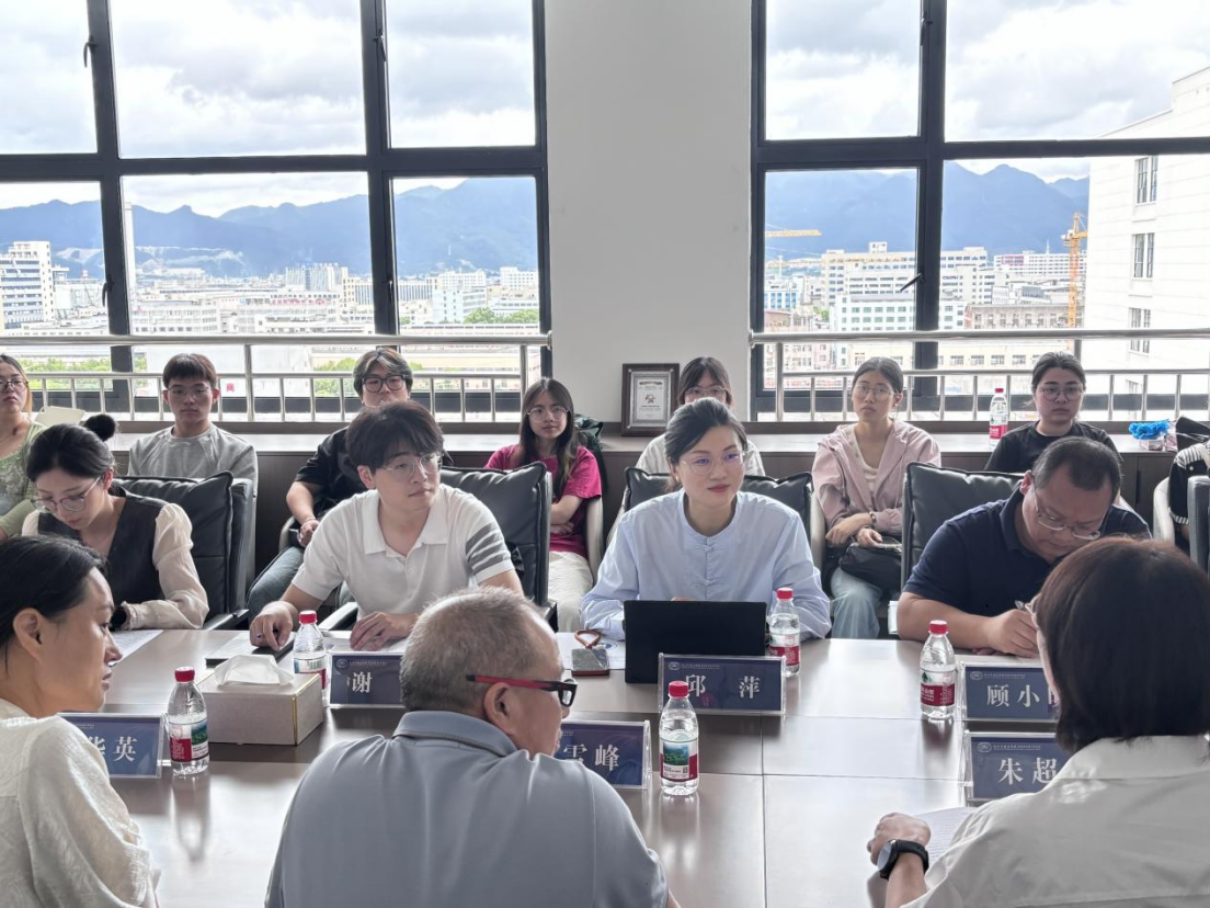 在跨境电商浦江研究院,院长梅雪峰,副院长董华英,浦江县司法局政治处主任朱振华,浦江县司法局依法治县秘书科科长朱超然等与师生团队共话涉外法治人才培养与跨境电商产业发展的深度融合路径。