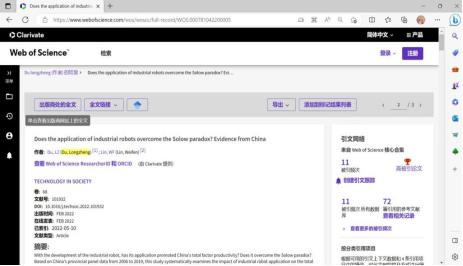 根据最新国际权威的基本科学指标(Essential Science lndicators),校西溪学者、数字经济与绿色发展研究所所长杜龙政作为第一作者,在线发表于2022月2月Technology in Society(《社会中的技术》SSCI一区)的产业数字化方面的文章Does the application of industrial robots overcome the Solow paradox? Evidence fromChina(《工业机器人的应用是否克服了索洛悖论?来自中国的证据》)成为高被引论文(截至2022年12月)。此高被引论文基于对应领域和出版年的高被引阈值,其被引频次已进入Social Sciences,general学术领域最优秀的1%之列。